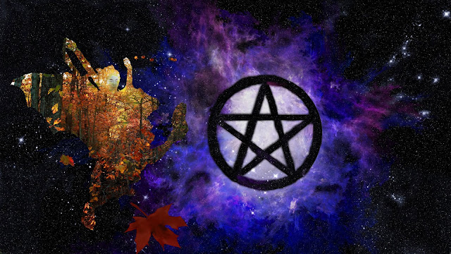Samhain. Halloween Goddess Pentacle Pentagram Space Nebula Fall Leaves